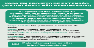 O Laboratório de Gestão do Saneamento Ambiental (Lagesa/CT/Ufes) está selecionando estudantes de graduação para atuar no projeto de extensão “Valorização de Resíduos Sólidos & Economia Circular: Percepções e ações para entrega voluntária”, com foco na aplicação de entrevistas presenciais à população da Região Metropolitana da Grande Vitória (RMGV).