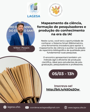 A iniciativa integra a pesquisa do doutorando Vilker Zucolotto Pessin, do Programa de Pós-Graduação em Educação (PPGE/UFES). Durante o encontro, os participantes conhecerão o Sistema Smart Bibliometrics, uma ferramenta de estratégias inovadoras para otimizar atividades acadêmicas, que auxilia no mapeamento da ciência e na seleção de repertório bibliográfico qualificado para fundamentar pesquisas.
